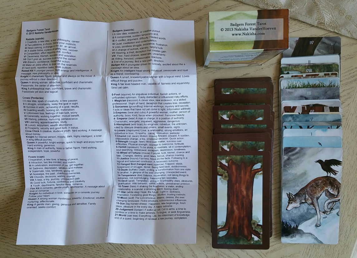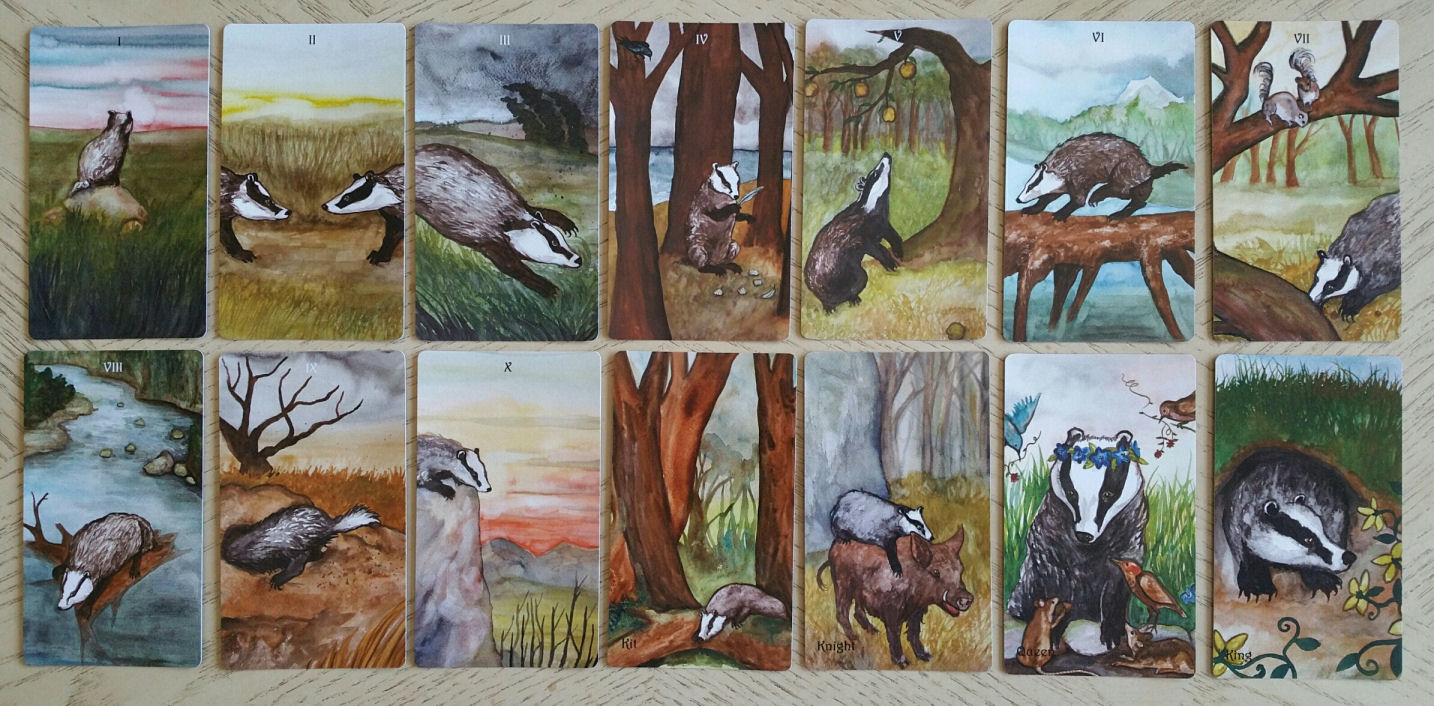 The Badgers Forest Tarot by Nakisha Elsje VanderHoeven, who is also the creatrix of The Rabbit Tarot, The TaRat (Tarot of the Rat), The BlueDogRose Tarot featuring domestic animals, and The Riderless Tarot, a horse-themed deck. I think she is an animal lover, but I’m not sure. You’ve got to check out all her tarot decks, which are self-published and listed through Etsy.