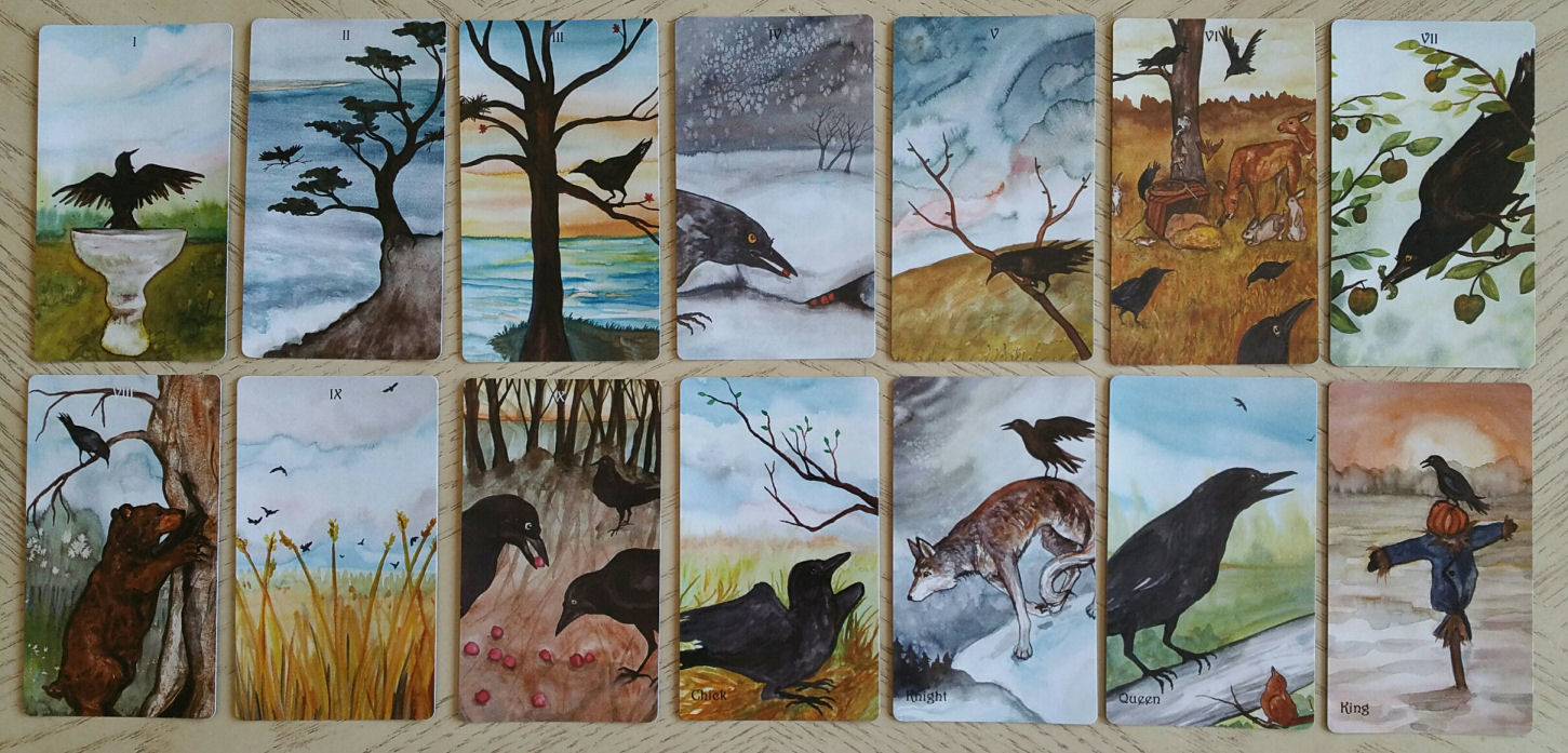 So here’s where I got a bit confused. Crows are the suit of Pentacles. Before checking out the fold-out guide that came with the deck, I presumed the Crows were Swords for Air, and then since I am an idiot I confused badgers with sea otters, so I thought the “sea otters” (aka badgers) were the suit of Cups for Water. I thought Red Foxes were Fire and I was so sure that Rabbits would be Earth, so I was all kinds of confused before checking out the fold-out guide.