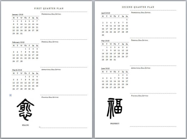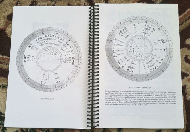 The Metaphysician’s Day Planner is customized, starting with your name. There’s space on the first page for you to write in your vision statement for 2018. Then, provided that you submit your birth and personal details, your natal chart and 2018 solar returns chart are the first front pages of your day planner.
