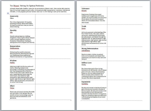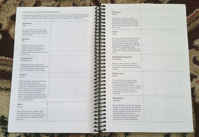 After that are the divinity page selections you chose and some spiritual planning for the year. Although using Buddhist vocabulary, the ideas are rather secular. There’s a page spread for you to contemplate the Ten Parami.
