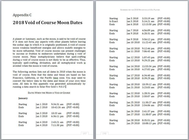 The appendices have info you may want to personally write in to your day planner, but weren’t included in the day planner since not everyone follows such info. For instance, Appendix C lists out all void of course moon dates for 2018.