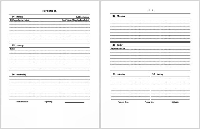 The bulk of the pages for the day planner will be the week-at-a-glance page spreads that help you log your everyday life. Holidays and astrological events are keyed to North America, so please keep that in mind. You’ll find loads of holidays from all over the world. There are the pagan holidays based on the Wheel of the Year, of course (North America). All the federal recognized holidays in the United States are on there. I’m including all the major Christian and Catholic holidays, Jewish holidays, Muslim holidays, Buddhist holidays, Chinese holidays, Hindu holidays, Baha’i, and more. Why? Mainly because I’m interested. I like how in a given week, when I note a particular holiday from a tradition I’m not familiar with, I’ll take the time to look it up, get my read on, and do some learning. It’s amazing and fun. And I hope having all of these holidays listed in your day planner will inspire you to do the same.