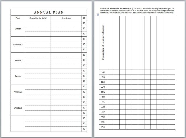 Like last year, there’s an Annual Plan or 2018 resolutions page, plus note the new entry to the right of the page below. These are screen shots, by the way, so don’t mind the squiggly lines for foreign spelling or table lines.