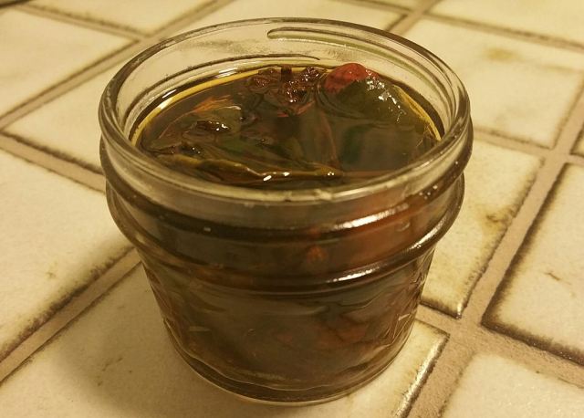 Then top the container off with the carrier oil, which in this example we’re using olive oil. As you add the olive oil, state an affirmative closing. I personally like: “By the powers vested in me, it is so ordered.” But hey, you do you. “So mote it be” seems to be popular.