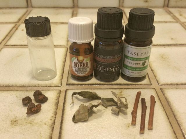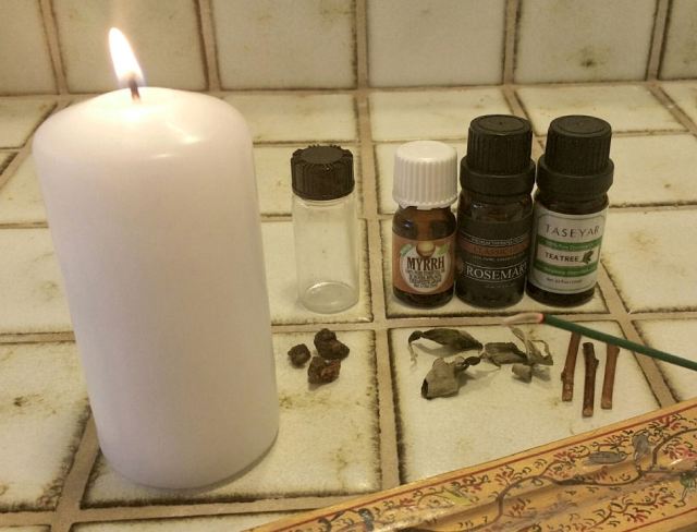 Light incense and a working candle. I like to start by anointing the working candle with all the oils that are going in to the spell oil recipe. So in this example, my working candle would be anointed with myrrh, tea tree, and rosemary essential oils.