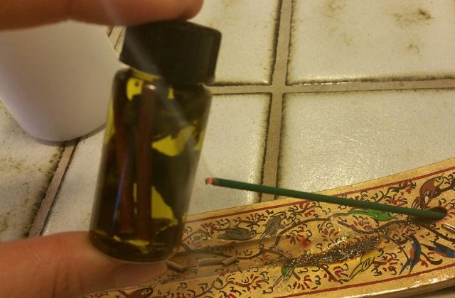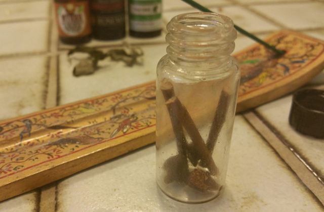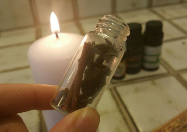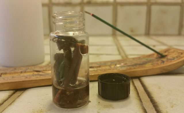 Finally, pass the finished oil through the smoke of the burning incense. Then snuff out the candle. You’re done.