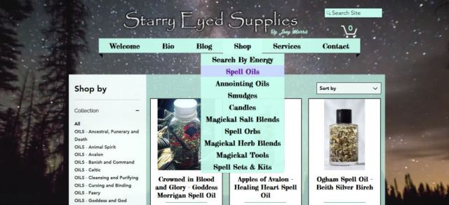 The first is Joey, of Starry Eyed Supplies. She also has an incredible YouTube channel where you can get yourself educated on all things witchy. Her spell oils are pretty incredible. She has a lot of well-established, long-standing proprietary oils for you to select from and she also takes totally from-scratch custom orders, so if you don’t see what you’re looking for, ping her with your custom order and she’s more than happy to fulfill.