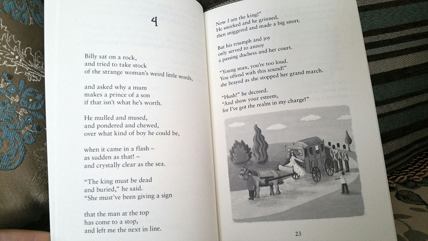 King Billy and the Royal Road by R. C. Ajounuma and published in the UK by SilverWood Books is endearing. The book is written in poetic form, triplet line stanzas with an AAB CCB rhyme scheme. You’ll also find a lot of slant rhymes, or near-rhymes. Here’s how the book starts: