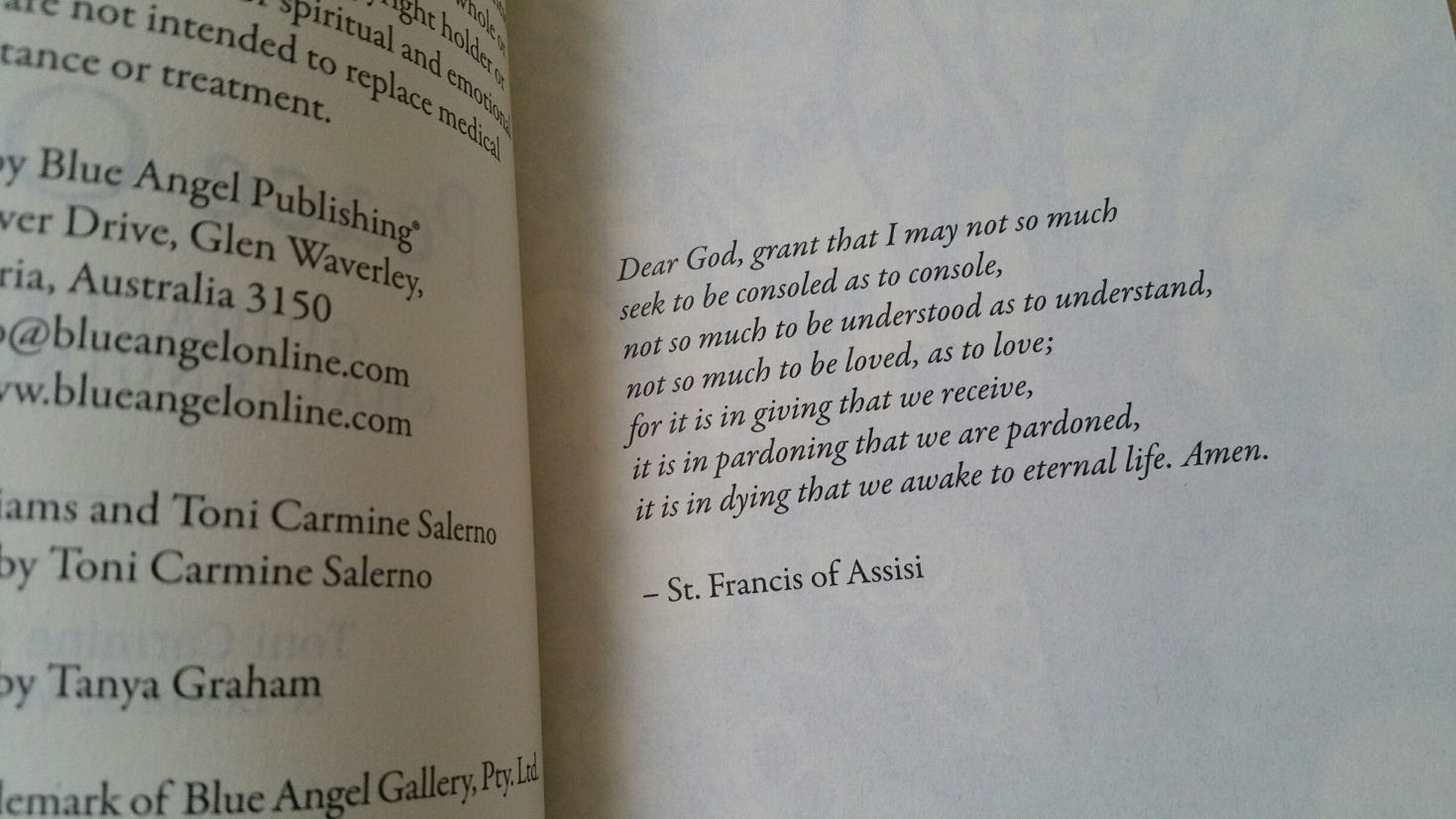 The book is written by Leela Williams, a writer, magazine editor, and psychic, and someone who has devote a lot of herself to the New Age spiritual community. I love the universal language of religion you’ll find in the companion guidebook. We begin on the cover page with a prayer attributed to Saint Francis of Assisi.