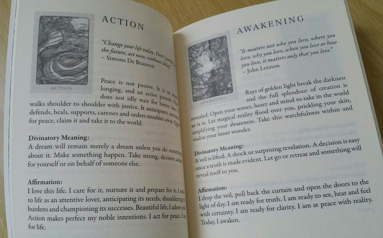 Each card is given a single page entry and provided in alphabetical order for easy referencing. You get an inspirational quote to go along with each card, and all the quotes I love. Great quote selections here by the creators. You get a description of the imagery to help you enter into the emotions and creative intuition of the card. Then you get the divinatory meaning and an affirmation to use along with the card you’ve pulled.