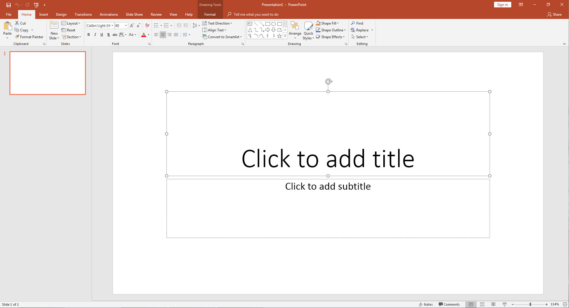 First, open PowerPoint on your computer. It came free with my computer. So it’s not even like I needed to buy any fancy tech to make YouTube videos. The default first slide will look something like the below. I select the text boxes and delete them so I can begin with a blank slate.