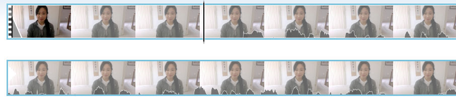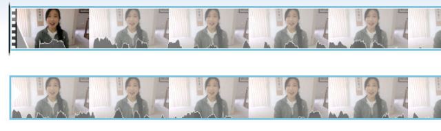 The above screen shot shows you what the first video clip should look like. Note the fragment of the second video clip after it and how there are no shaded wavy lines yet. That’s because that part of the clip shown is all silence (the quiet counting part). Meanwhile, now the edited first clip pretty much has shaded wavy lines right from the start and right to the end.