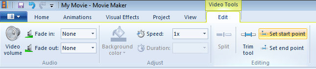 Once you’ve positioned the black vertical bar where you want the video clip to start (and all preceding part cut out), go up top, click the “Edit” tab, then select “Set start point.” You’ll see it highlighted in the image above.