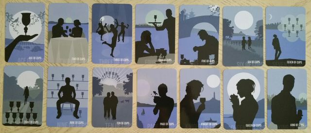 Next, blue for watery Cups. I also love the recurring motif of the full moon throughout the deck, kind of a symbolic nod to the idea of shadow, reflections, and spirit.