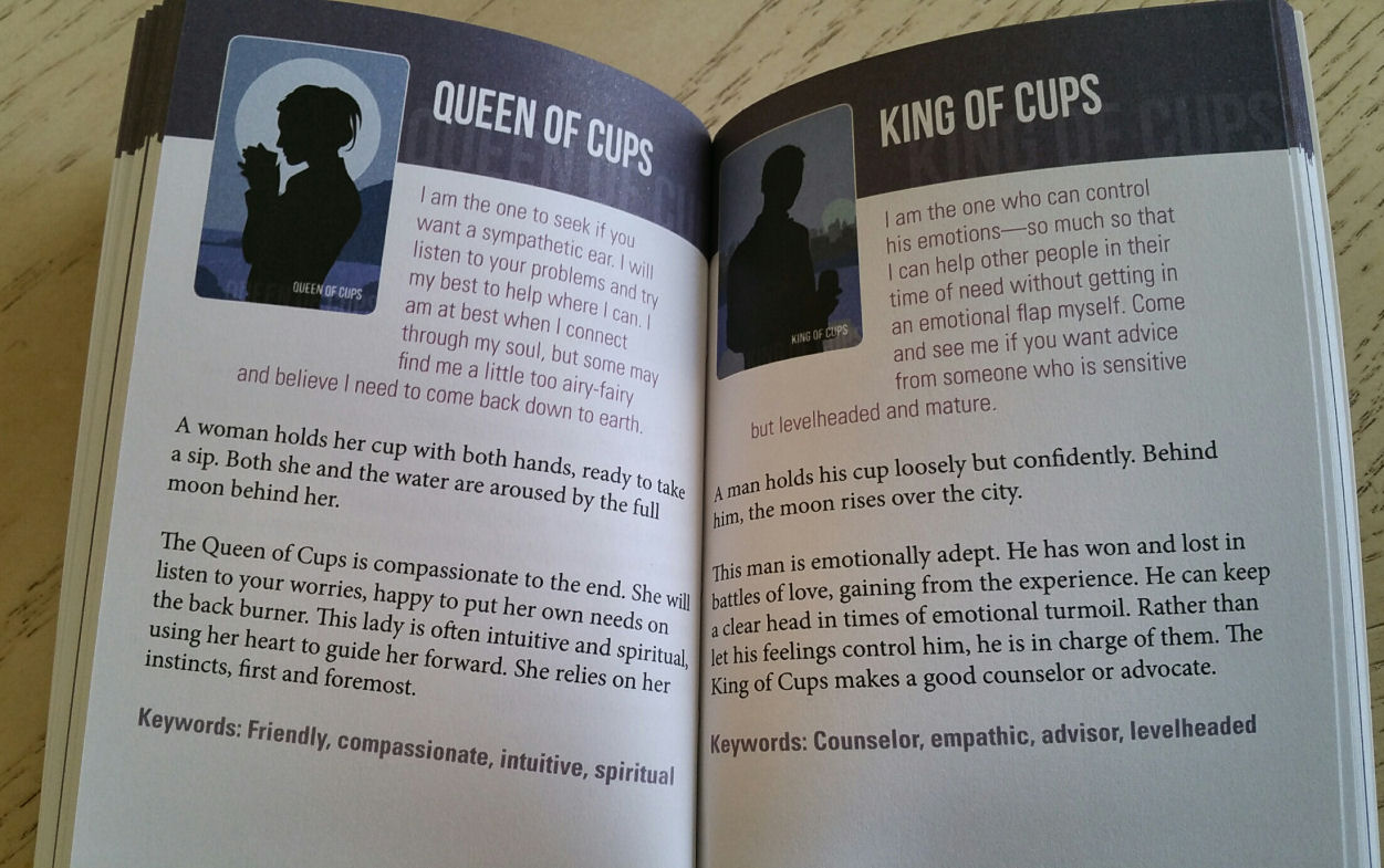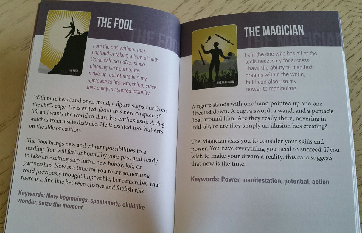 The channeled voice of each card’s archetype that Bright gives us in print is magnificent. I love the use of first person here when detailing the meanings for each card. Then after what reads like first-person channeled writing, you get the more formal description of the card, plus keywords.