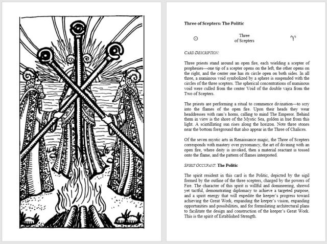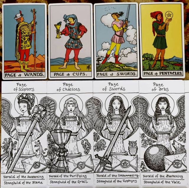 The four suits of pips (Scepters, Chalices, Swords, and Orbs, corresponding with Wands, Cups, Swords, and Pentacles) represent the four elements Fire, Water, Air, and Earth respectively. The fifth element of aether, or quintessence, what often gets referred to as Spirit, is represented by these courts. So in Spirit Keeper, the four courts are the bridge between the 22 Keys of the Major Arcana (the primordial spirits roster) and the Aces through Tens (the 40 universal spirits). All of the court cards in Spirit Keeper would stand in for Holy Guardians.