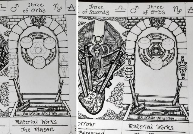 From my perspective (I don’t mean the deck itself; I mean what I had to go through to create the deck) is so Three of Orbs, especially this Three of Orbs. I’ve really felt like The Mason and I love the two phrases inscribed onto the card. Labor omnia vincit— hard work conquers all. Ex nihilo nihil fit– nothing comes from nothing.