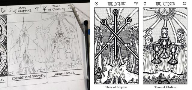 Given where I want to go with the courts, I’m pretty apprehensive about depicting the Queens and Kings. I can’t fully convey how much thought and scrutiny has gone in to designing these court cards. Just to give you a clue, I’ve been doing copious research and reading into Judaism, Christianity, and Islam.