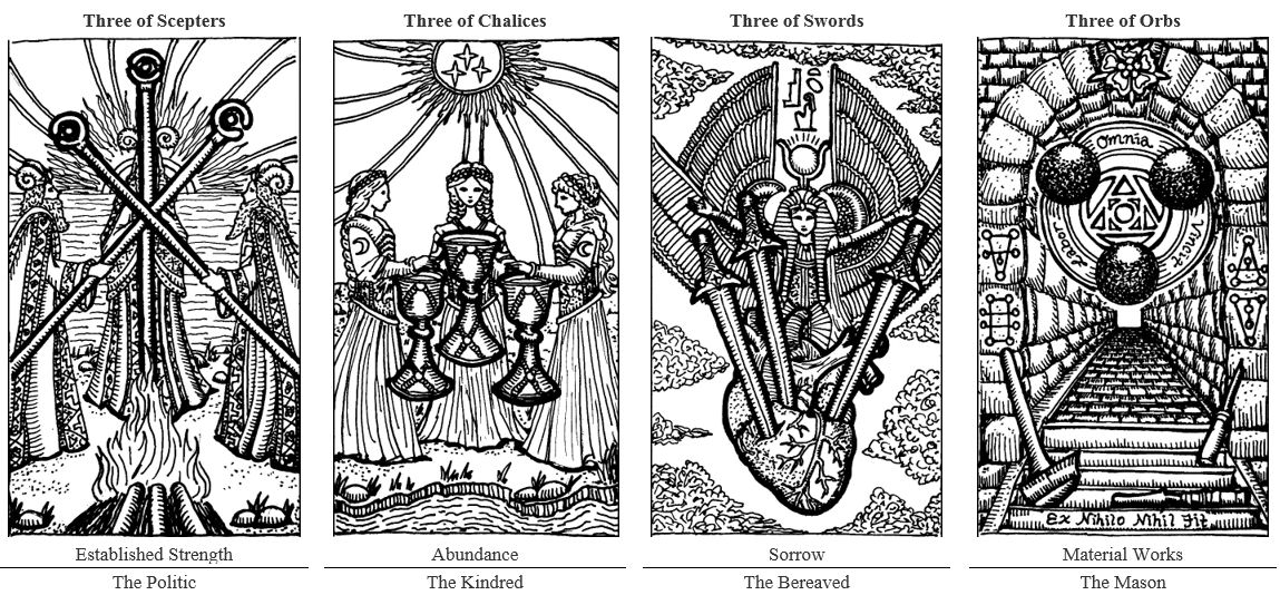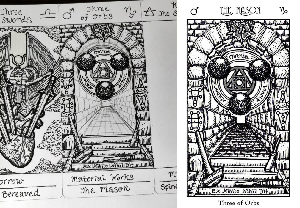 From my perspective (I don’t mean the deck itself; I mean what I had to go through to create the deck) is so Three of Orbs, especially this Three of Orbs. I’ve really felt like The Mason and I love the two phrases inscribed onto the card. Labor omnia vincit— hard work conquers all. Ex nihilo nihil fit– nothing comes from nothing.