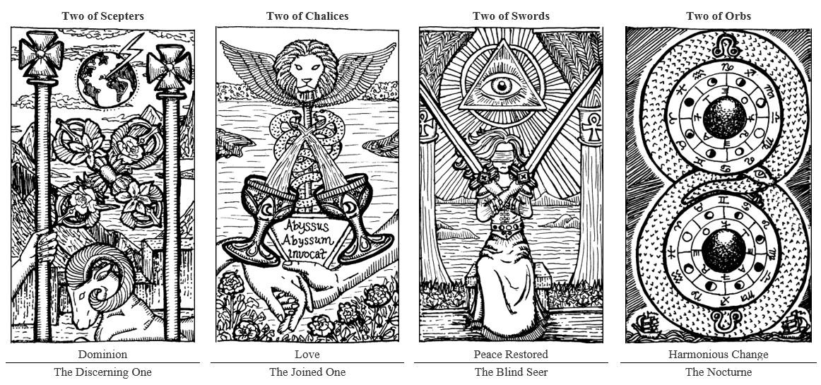 Tuesday July 10 I proceeded on to the Twos and finished them by Wednesday July 11. The Twos are significant because it’s the first point of contact between the elemental forces in the spiritual-psychic plane and the material plane, before there is a material plane. It’s the first emergence of sapling shoots after the seed. So I felt a lot of pressure to be methodical, conscientious, and intentional with how the Twos would be depicted.