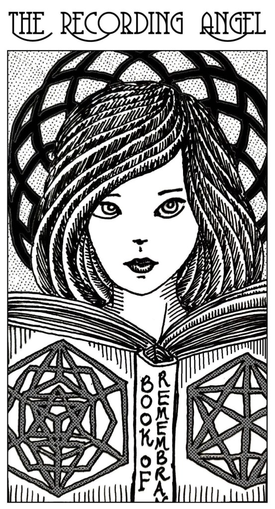 ANGEL WHO RECORDS, whose Hand seals upon the Book of Remembrance, who bears witness to All to enumerate every deed, since Creation, from the beginning of the world to this day, from my cradle to my grave, I invoke you to read to me, to show me, to transcribe upon my heart, to place upon the mantle of my mind the pages of the Book I petition for. Let it be the Truth. Let that Truth, come what may, ever be used to work the Highest Good. And so may it be.