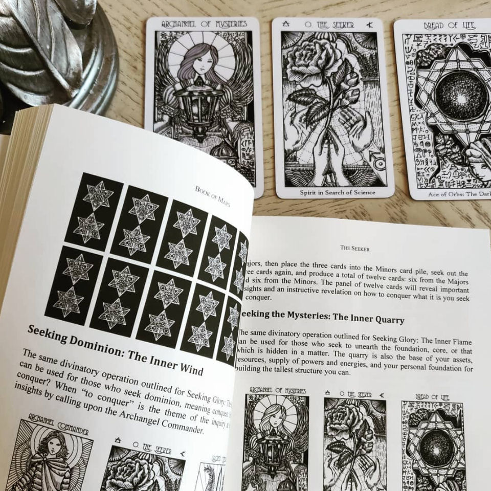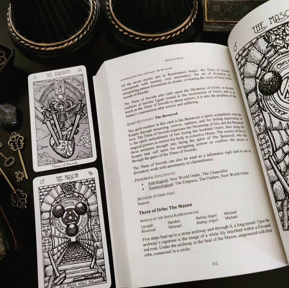 Each tarot card in Spirit Keeper is a map of the corresponding dominion of an angelic being. Each physical card is the gateway to that world and the guidebook is a manual for helping you walk through that gateway. The maps are drawn under an esoteric system of cartography and so that’s what The Book of Maps is for: to explain that esoteric system of cartography.