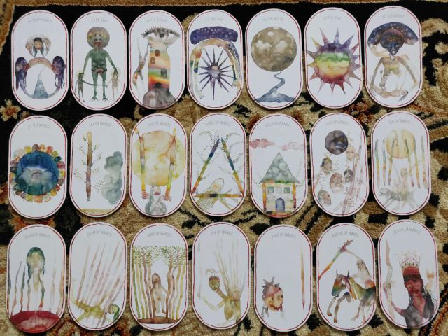 The first thing you might notice about Zuspan’s deck is the unique shape: it’s elliptical. Historic playing cards from the late Middle Ages could be found in this unique shape, though over the centuries, the standardized 2.75″ x 4.75″ rectangle for tarot decks has become the norm. Zuspan was inspired to create a deck in the elliptical shape when she saw 15th century playing cards at the Cloisters in New York City.