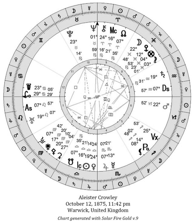 Let’s address the astrological charts of Arthur Edward Waite and Aleister Crowley. I wasn’t able to source reliable records of Waite’s time of birth, but we do know his date of birth and location of birth.