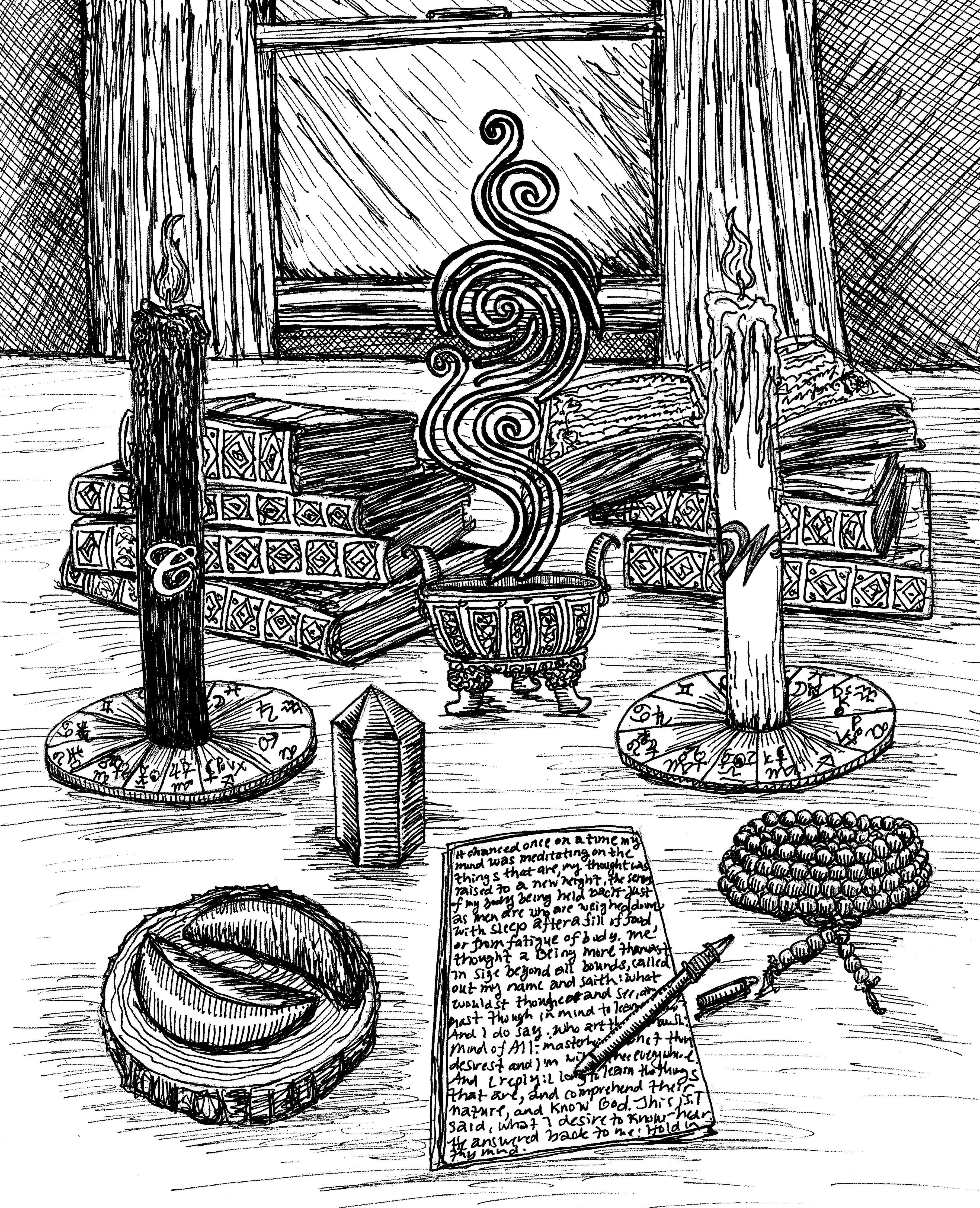 My purpose for including this section is to document my personal ritual practices in attempting to evoke the spirit presence of A. E. Waite and Aleister Crowley, with my own Holy Guardian Angel present, while conceiving Spirit Keeper’s Tarot. This is not a how-to instructional nor does it purport to teach anything about evocation. Treat this section as nothing more than a memoir of what I did to create my tarot deck.