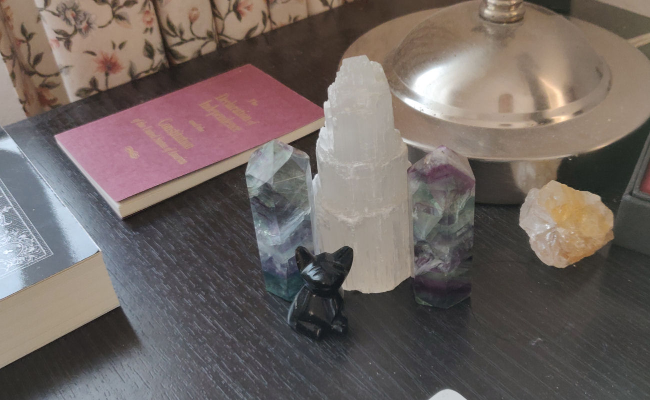 Though it wasn’t mentioned in the video because it isn’t necessary, I do like to set up a little crystal something nearby. There’s absolutely no need for one, unless you feel like you need one. Here I have a selenite tower surrounded by twin fluorite terminated peaks. I also have a little obsidian cat friend to watch over me. The raw citrine quartz you see at right isn’t part of my setup; that’s just something I always have in my home office.