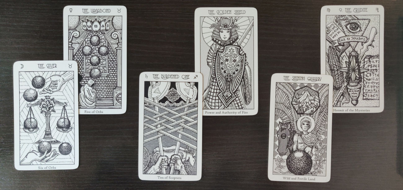 In my personal reading, the spirit that came forth was The Vagabond, so this is going to indicate to me the most prevailing archetype reflected by my head space at the moment. The card I pulled to express my thought plane was the Six of Orbs (Six of Pentacles). So I would then read this revelation through the themes of my aspirations, goal-setting at the moment, and that which is still intangible as thoughts in my mind that I haven’t yet set into action or materialized.