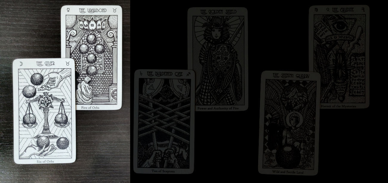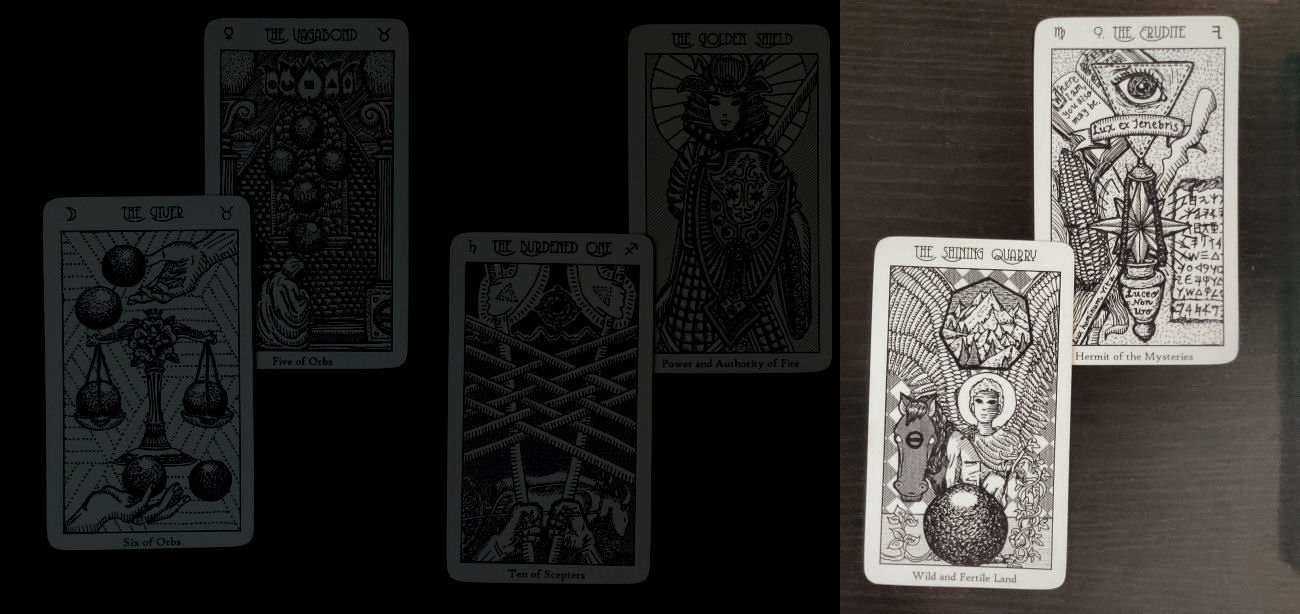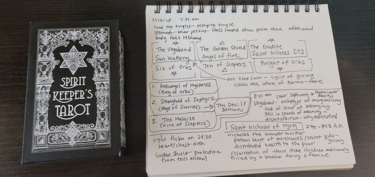 You’re going to need your Spirit Keeper’s deck on hand, and also a journal or notebook to write in, along with a writing instrument. Having your copy of The Book of Maps on hand is optional, though you may find that reading the passages for the card entries help prompt revelatory hits for your own results.