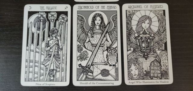 In my reading, I saw the Nine of Scepters as revealing of a character trait that the Records is reflecting back at me, so that I might look at this facet of myself with more discernment. I’m going to read the Stronghold of the Zephyrs (Page of Swords) in a two-fold manner. It’s a messenger angel (which is why I then pull another card, the message card from the angel) and it’s the associated personality for the Page of Swords card in  tarot. Funny enough, yet another court card popped up– the Archangel of Mysteries, which can also be read as the King of Pentacles in the tarot. These three cards together are a mirror reflection of who I am at the moment, positive and negative.