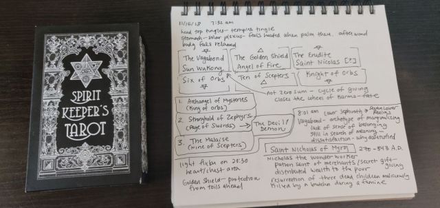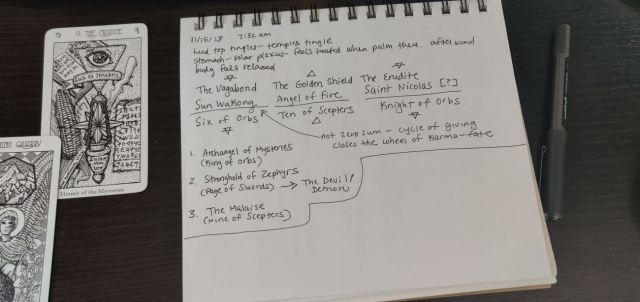 The above snapshot shows what I managed to write down during the three minutes allotted. I used the three minutes to write down the card reading results and some quick impressions. Note also that during the reading (as prompted in the voiceover), for me, in this specific case (this does not always happen, so don’t fret if it doesn’t happen for you), names or identities immediately popped in to my head in response to seeing the three spirit cards.