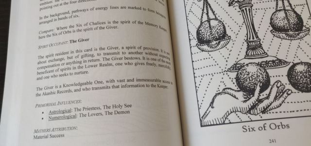 However, when you get to the message card (the second card you pull, one to indicate the message from each of the three guardian spirits), now you focus on the tarot card correspondence. The Vagabond (Five of Orbs) delivered me the message of the Six of Orbs (which corresponds to the title The Giver).