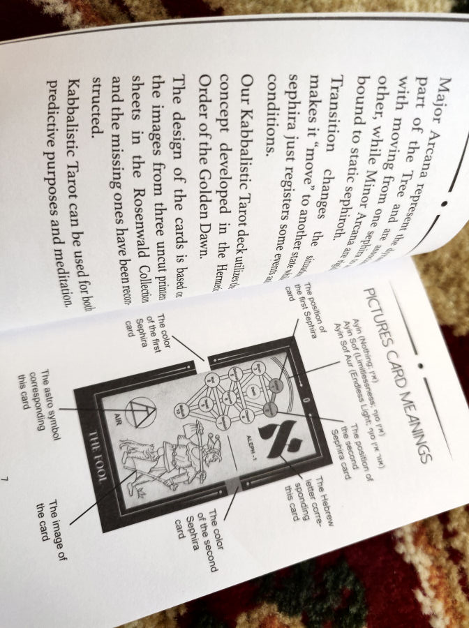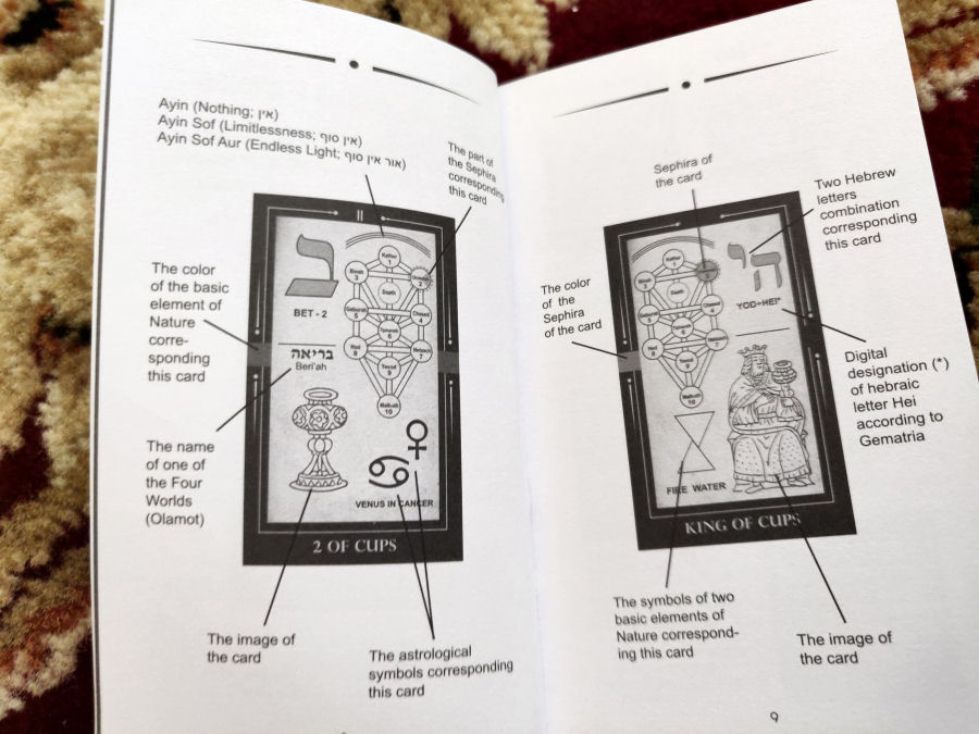 The above page from the little white booklet is your key to everything you see on each card. Later you’ll see how on every card, above the Kabbalistic Tree of Life are these arcs, which symbolize Ayin Sof Aur, the Endless Light.