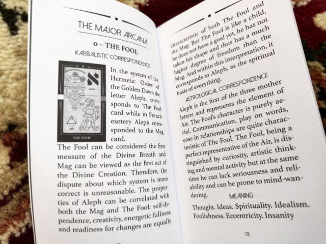 The little white booklet offers a surprising amount of information. For each Key in the Majors, for instance, you get several paragraphs on the Kabbalistic correspondences per the Golden Dawn, the astrological correspondences for each Key, and then the attributed meaning for divinatory interpretation. You’ll see the meanings ascribed feel quite Marseilles to me.
