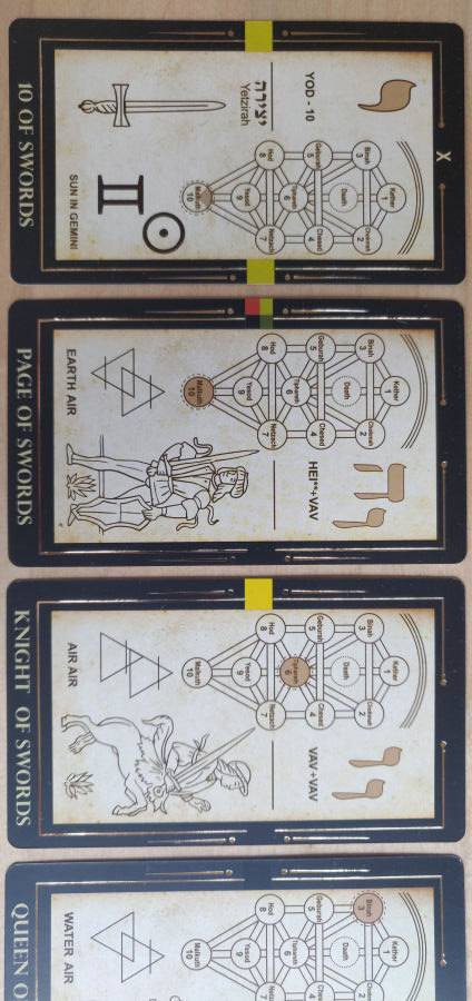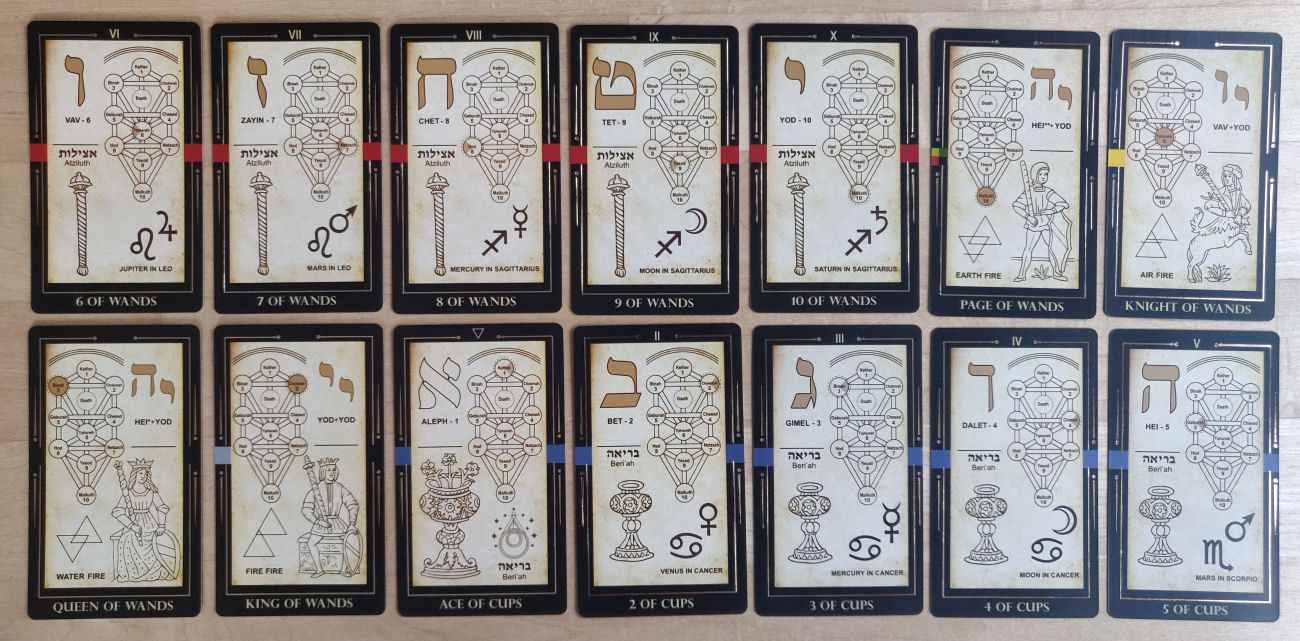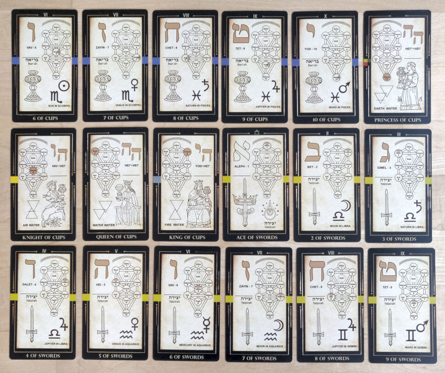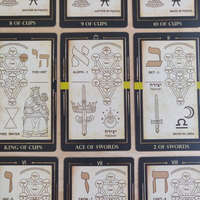 Gematria is also incorporated into the iconography on each card. On the Majors you have the Hebrew letter corresponding with each of the 22 Keys and in the Minors, you have the two Hebrew letters in combination that correspond with that card.