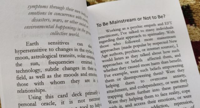 Earth sensitives (also known as earth empaths), according to Peterson, are individuals who are hypersensitive to environmental changes, and therefore find that their own emotions are tied to natural disasters, war, social conflicts, and cyclic changes around them. Healers of the Earth Oracle is intended to help earth sensitives gain greater control over their empathic abilities.