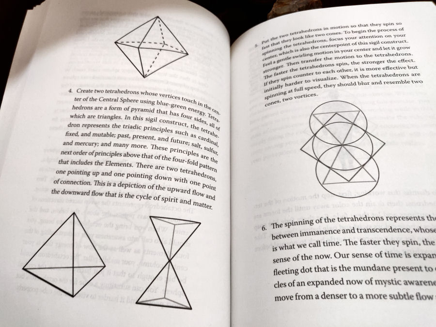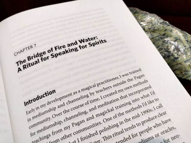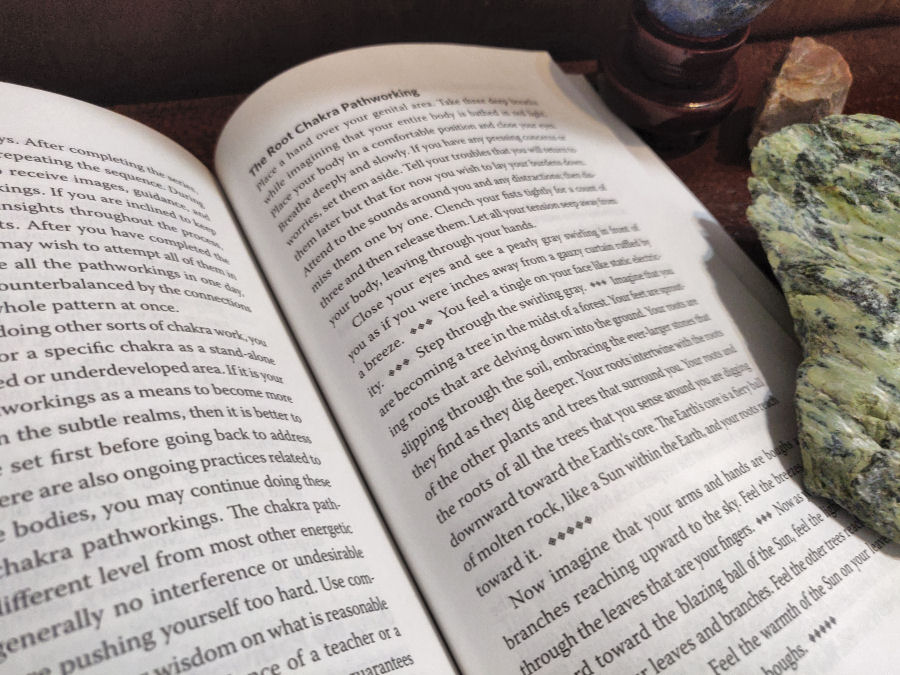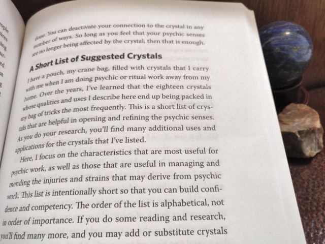 There’s a chapter on working with gemstones and crystals for psychic development, and how to program and empower a crystal. He shares instructions on how to craft a cord wand where cord made of a natural fiber is tied into a loop, soaked in a consecrated water and anointing oil, empowered through ritual magic, and then kept on hand any time you need to use it to enclose and protect a particular space.