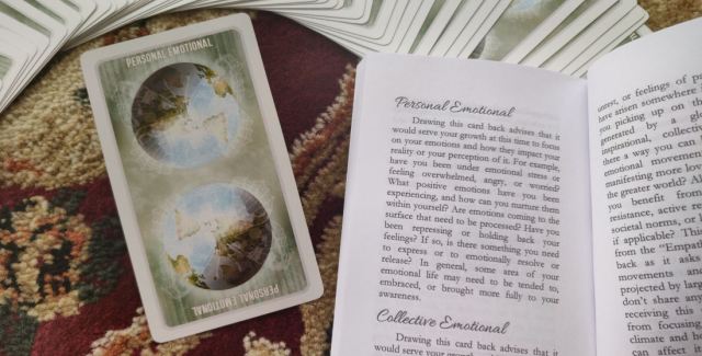 I start by checking the category noted on the card back. Since my eyes were closed, this was randomized. I pulled Personal Emotional. According to the guidebook, drawing a card from the Personal Emotional category advises that right now it would serve my growth if I focused on my emotions and how my emotions are impacting my reality. Dammit, cards. Right on.
