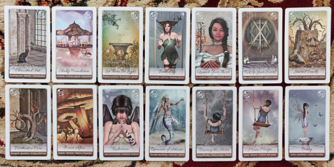 Then I assembled them back together, followed an invocation prayer given in the guidebook, and then fanned out the cards. I closed my eyes and with my palm gliding across the fan, pulled a card at random.