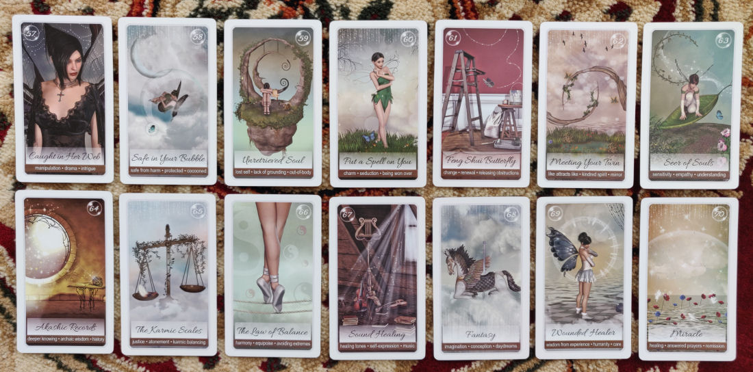 I think, though I’m not entirely sure, these categories as noted in the guidebook (and on the card backs) are the same categories noted in the product description you’ll find on the back of the box, though using slightly different terminology. In the product description, the deck is described as grouped into categories that include Air and Atmosphere, Land and Earth, Fire and Smoke, Water and Rain, Ice and Snow, Industry and Technology, Purification and Release, Spiritual Hygiene, and Health and Healing.