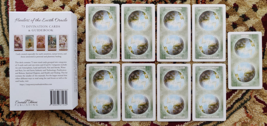 The card backs are part of the divinatory process. There are nine different categories: Personal Physical, Collective Physical, Personal Emotional, Collective Emotional, Hypervigilance & Illusion, Industry & Technology, Purification & Release, Spiritual Hygiene, Empathy & Relationships, and the Unknown.