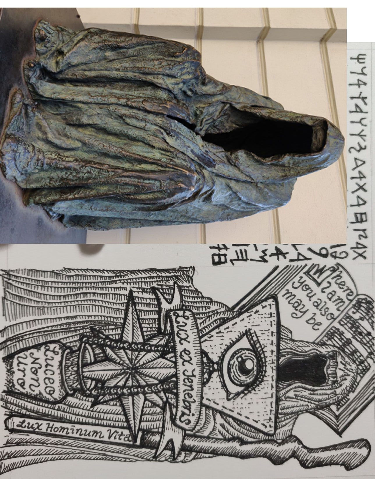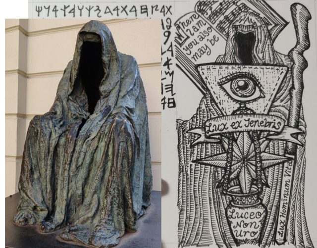 I was inspired by the Il Commendatore statue in Prague, also known as the Cloak of Conscience. You’ll see a photograph I took of the sculpture at left, commissioned in honor of Mozart, by the way, and then my pen and ink line drawing of it (still an unfinished work in progress in the above photo).