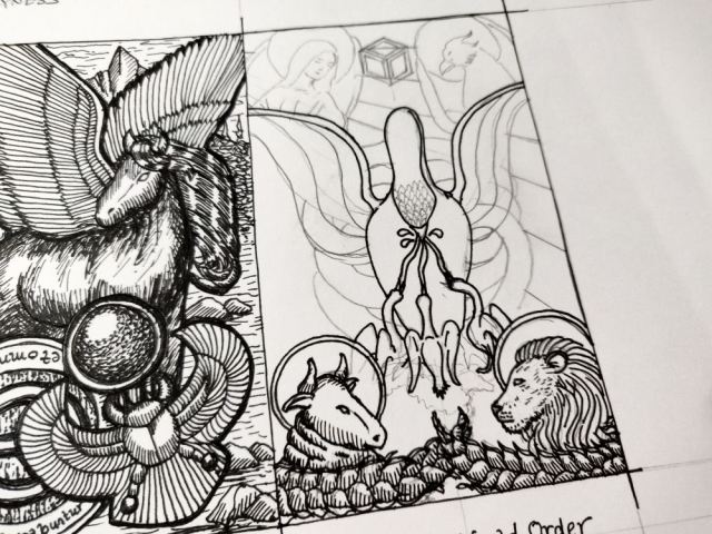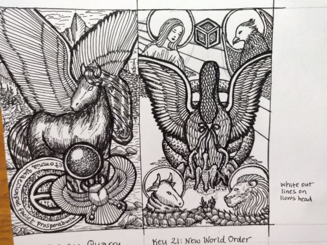 Here’s the Emperor card mid-sketch where I’m still doing the basic outlines with the ink. Haven’t gone in to fill out the depth yet, though you see I’ve started on the ram horns at the top.
