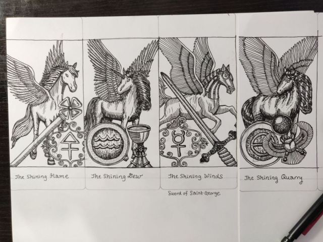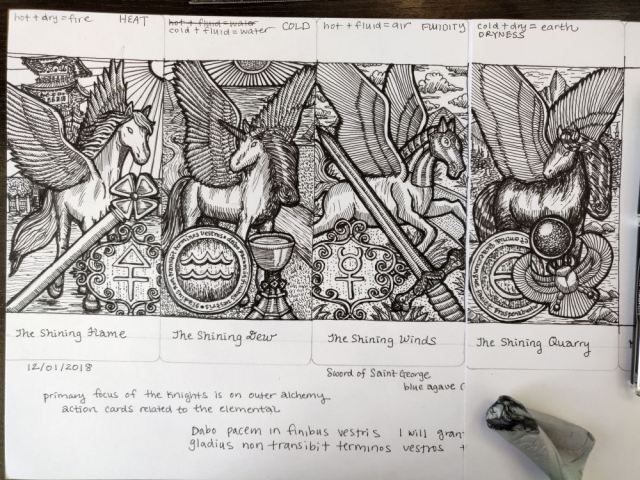 So I knew I wanted to re-conceptualize the four Knights. This time, my focus would be on alchemy. Here’s my first sketch, in pencil: