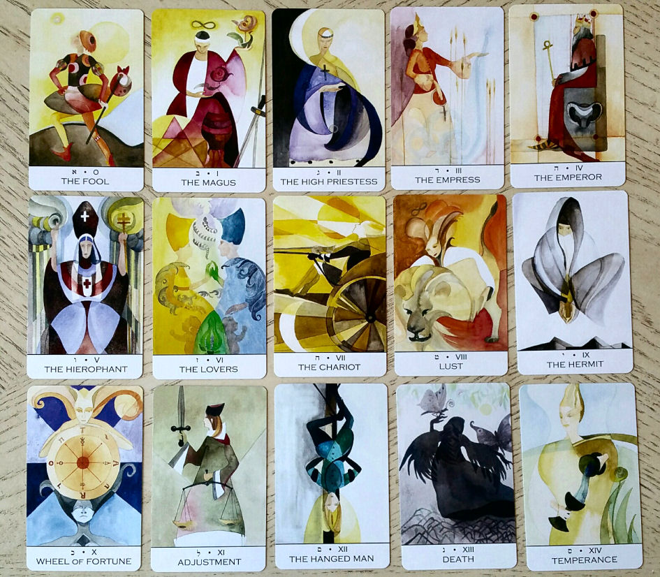 The abstract cubist style pays a clear homage to Lady Frieda Harris’s style. That Death card is just absolutely beautiful and to me, almost has a dark goddess vibe to it. Some of the symbolic renderings in the Majors feel more RWS to me than Thoth, like how Key 8, while titled Lust, is positioned as it would be in the RWS (whereas Crowley goes through quite the trouble explaining white Lust/Strength “should” be Key 11) and Key 11 is Justice/Adjustment. Also, the depictions, most notably in The Hermit card, or even the Wheel of Fortune feel more RWS than Thothian.
