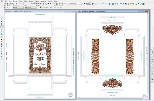 For the interior, I still like how the top lid interior looks (above left) but I’m kinda meh about the bottom lid interior (above right). Switching it out, though, means now I need to figure out what to switch in.