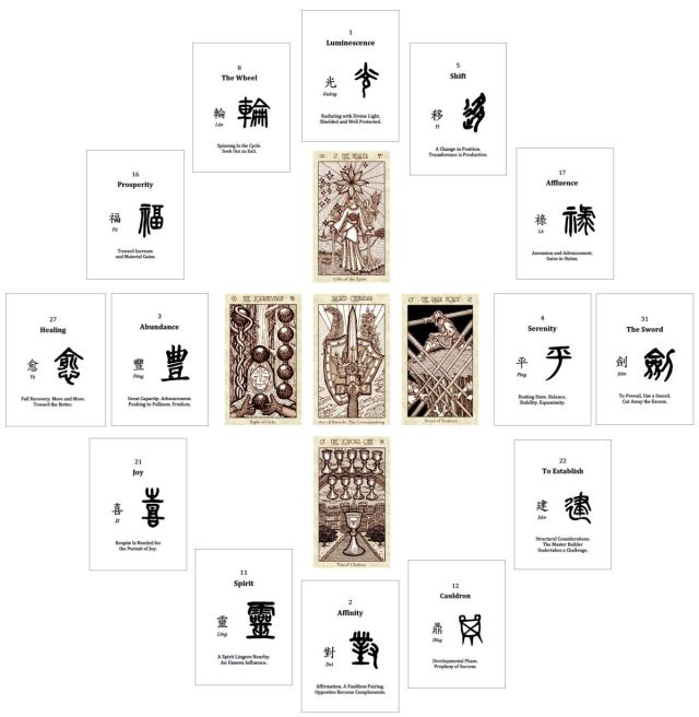 Above you’ll see I’ve cast a circle around my five selected tarot cards, using the Chinese oracle bone script divination deck. You can download the formatted digital files of the Chinese oracle bone script divination deck for free, over on the Tao of Craft Downloads Page or just see below.